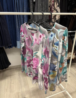 Bluză elegantă cu imprimeu floral și abstract în culori vibrante – perfectă pentru a aduce un strop de prospețime și stil ținutelor tale de zi cu zi.