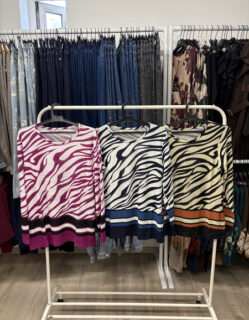 Bluză cu imprimeu animal print tip zebra, modernă și versatilă, disponibilă în mai multe combinații de culori.