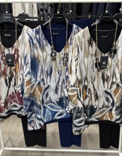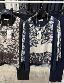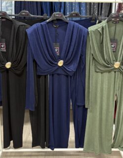 Un set care îți pune în valoare feminitatea. Broșa aurie transformă ținuta într-un statement