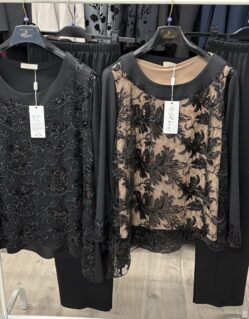 Set sofisticat format din bluză cu broderie rafinată și pantaloni uni, perfect pentru evenimente deosebite.