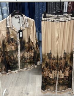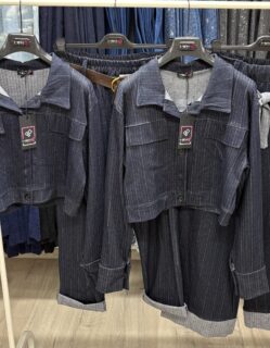 Set modern din două piese, realizat din material tip denim cu dungi fine, compus din cămașă și pantaloni asortați.