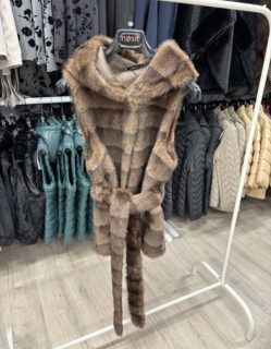 Vestă elegantă din blană, cu cordon reglabil în talie. Un model modern, călduros și sofisticat, ideal pentru zilele răcoroase de toamnă și iarnă.