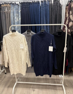 Rochie tricotata groasa, cu model elegant în relief și guler înalt, ideal pentru zilele reci de toamnă și iarnă.