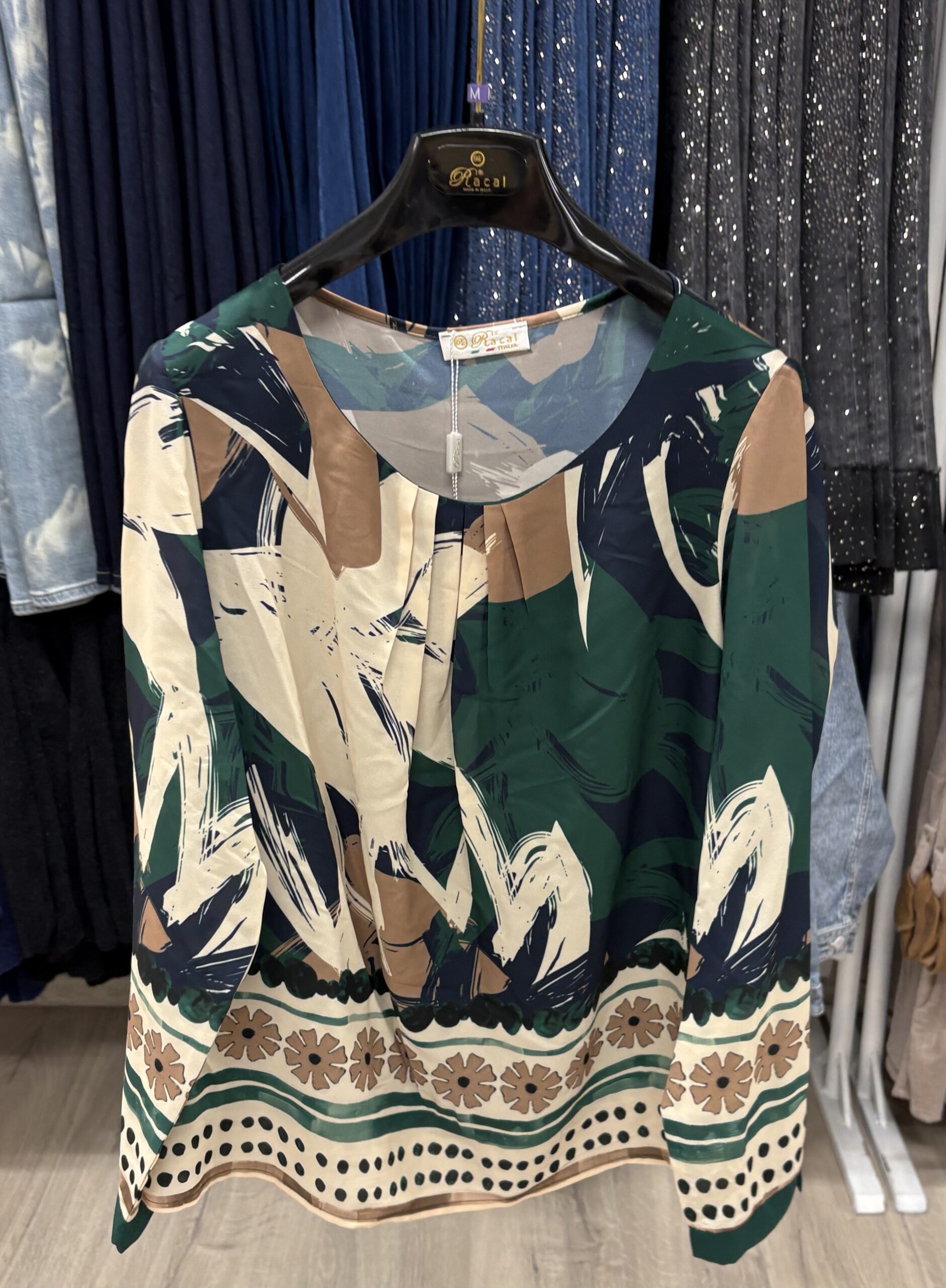 Această bluză cu imprimeu artistic în nuanțe de verde, crem, albastru și accente bej este piesa ideală pentru a adăuga personalitate garderobei tale. Croiala lejeră și materialul ușor o fac confortabilă, iar detaliile decorative de pe tiv aduc un plus de originalitate. Perfectă pentru ținute casual chic sau pentru birou, se combină ușor cu pantaloni uni sau jeanși
