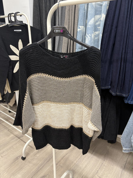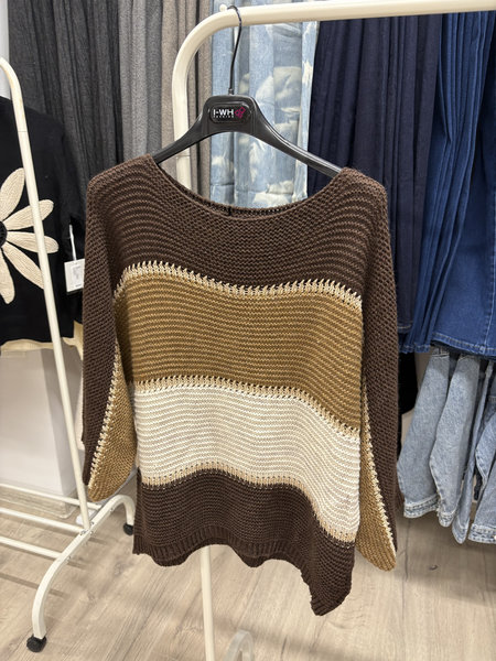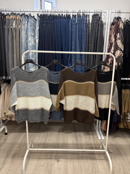 Acest pulover tricotat cu dungi late este alegerea perfectă pentru ținutele de zi cu zi. Designul său lejer și combinațiile armonioase de culori neutre și pământii îl fac ușor de purtat și de asortat. Materialul moale și plăcut la atingere oferă confort pe tot parcursul zilei, iar croiala clasică îl face potrivit atât pentru ținute casual, cât și pentru un stil relaxat de birou. Versatil și modern, acest pulover este un must-have în garderoba de sezon.