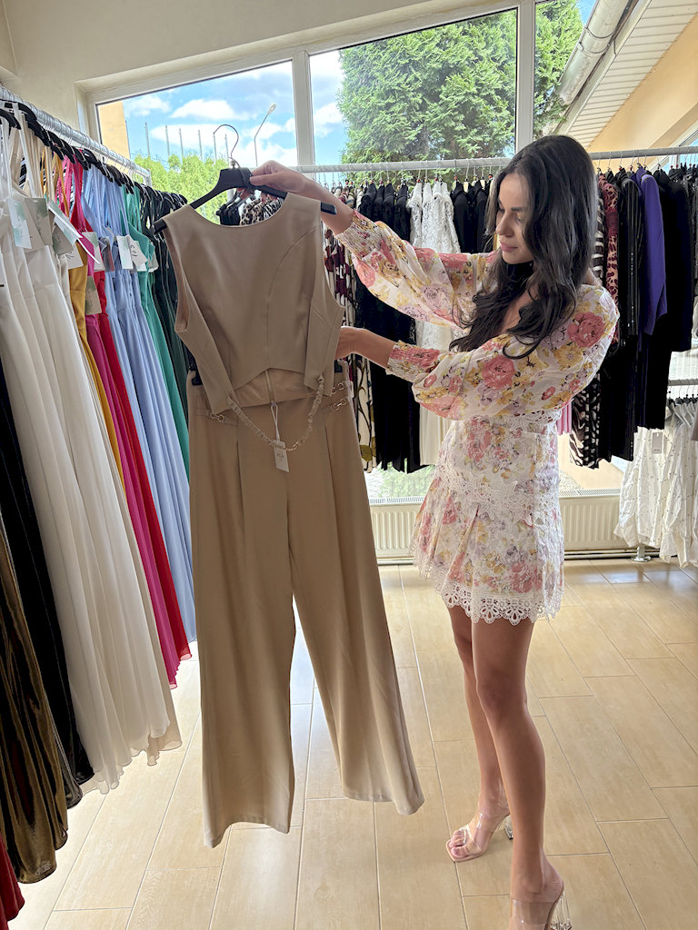 Compleu disponibil în nuanțe bej și crem ideal pentru momente de activități relazate, shopping, sau ieșiri formale. Piesa se remarcă prin cu un design elegant, lejer care va atrage privirile. O piesa versatilă în grderobă, care adaptata ocaziilor de tot felul.