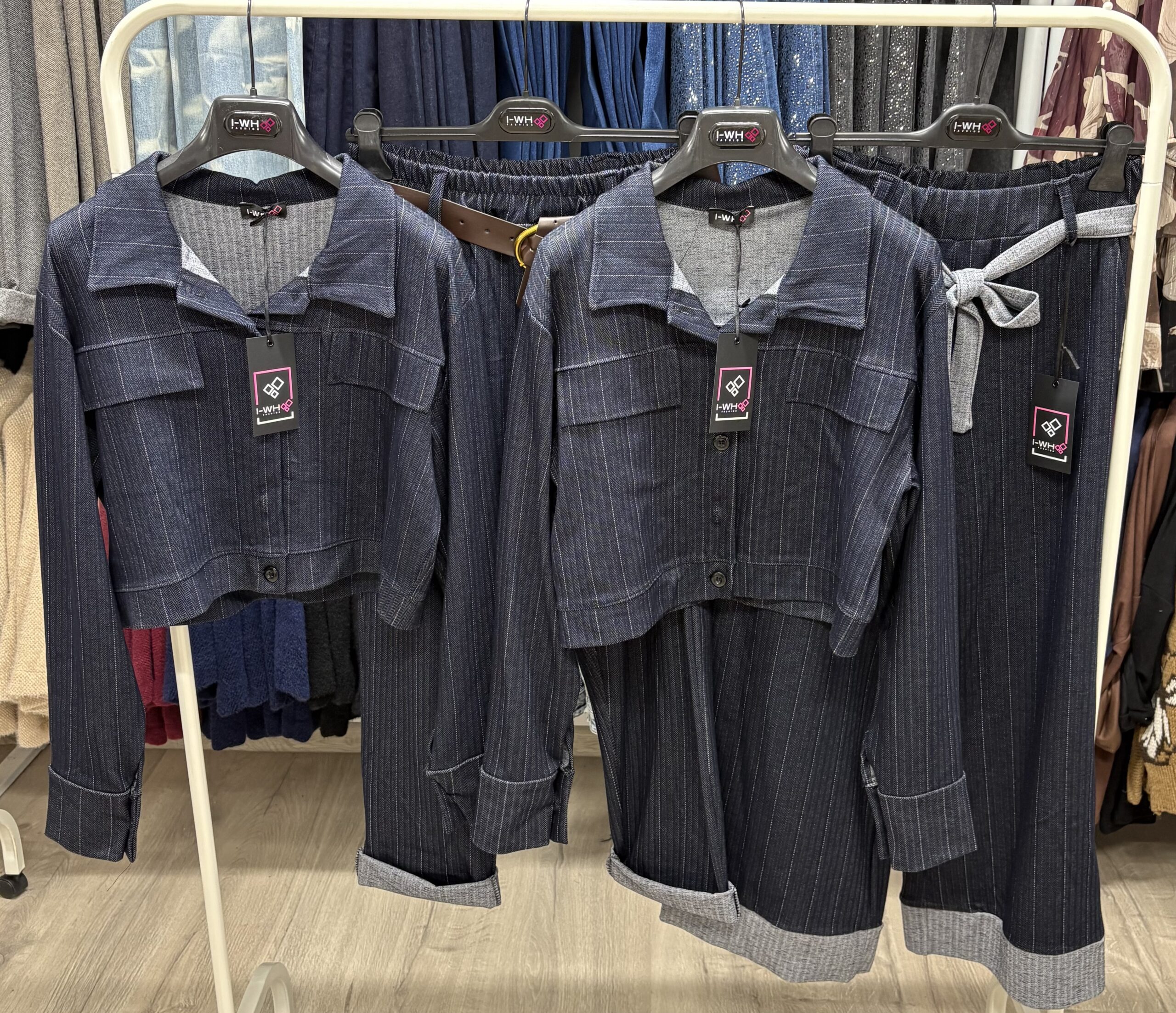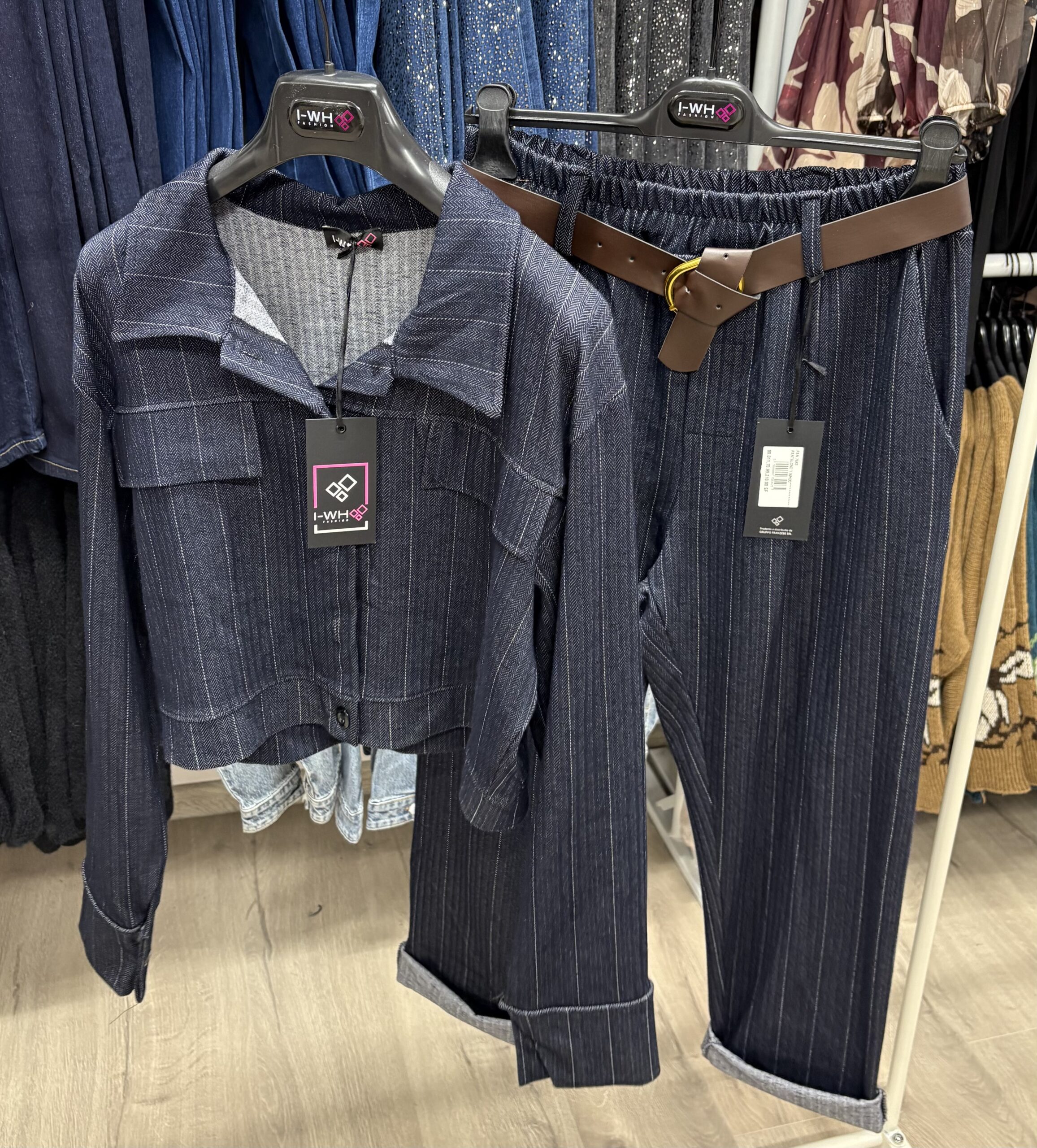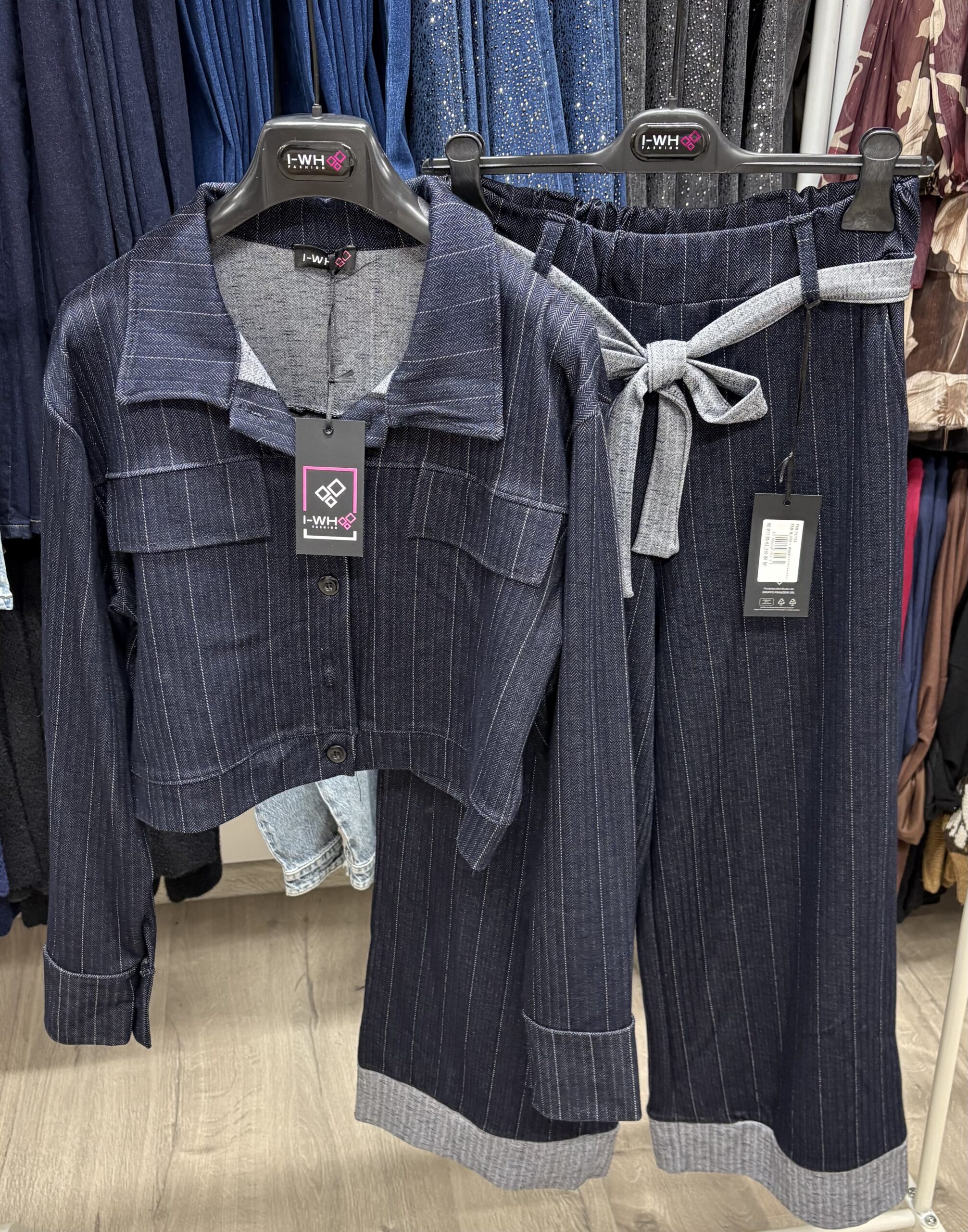 Set modern din două piese, realizat din material tip denim cu dungi fine, compus din cămașă și pantaloni asortați.