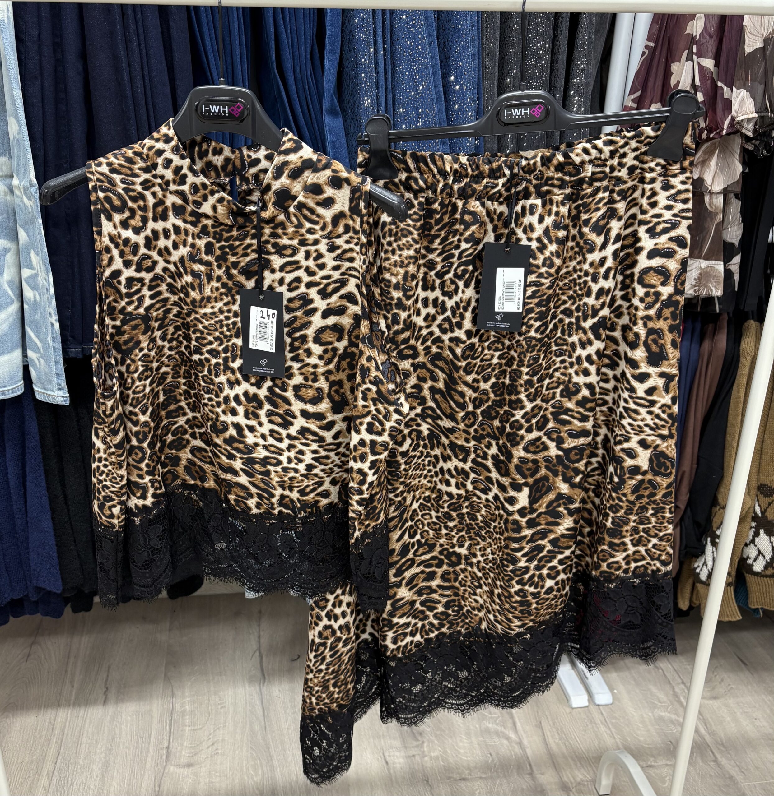 Un set care respiră feminitate și încredere în sine. Realizat din material cu imprimeu leopard, pune în evidență latura îndrăzneață și pasională a oricărei femei. Topul fără mâneci adaugă lejeritate și versatilitate, în timp ce fusta midi este finisată cu detalii fine din dantelă neagră, ce îi dau un aer sofisticat și senzual. Perfect pentru o ieșire de seară, o petrecere sau o cină specială, acest set atrage toate privirile.