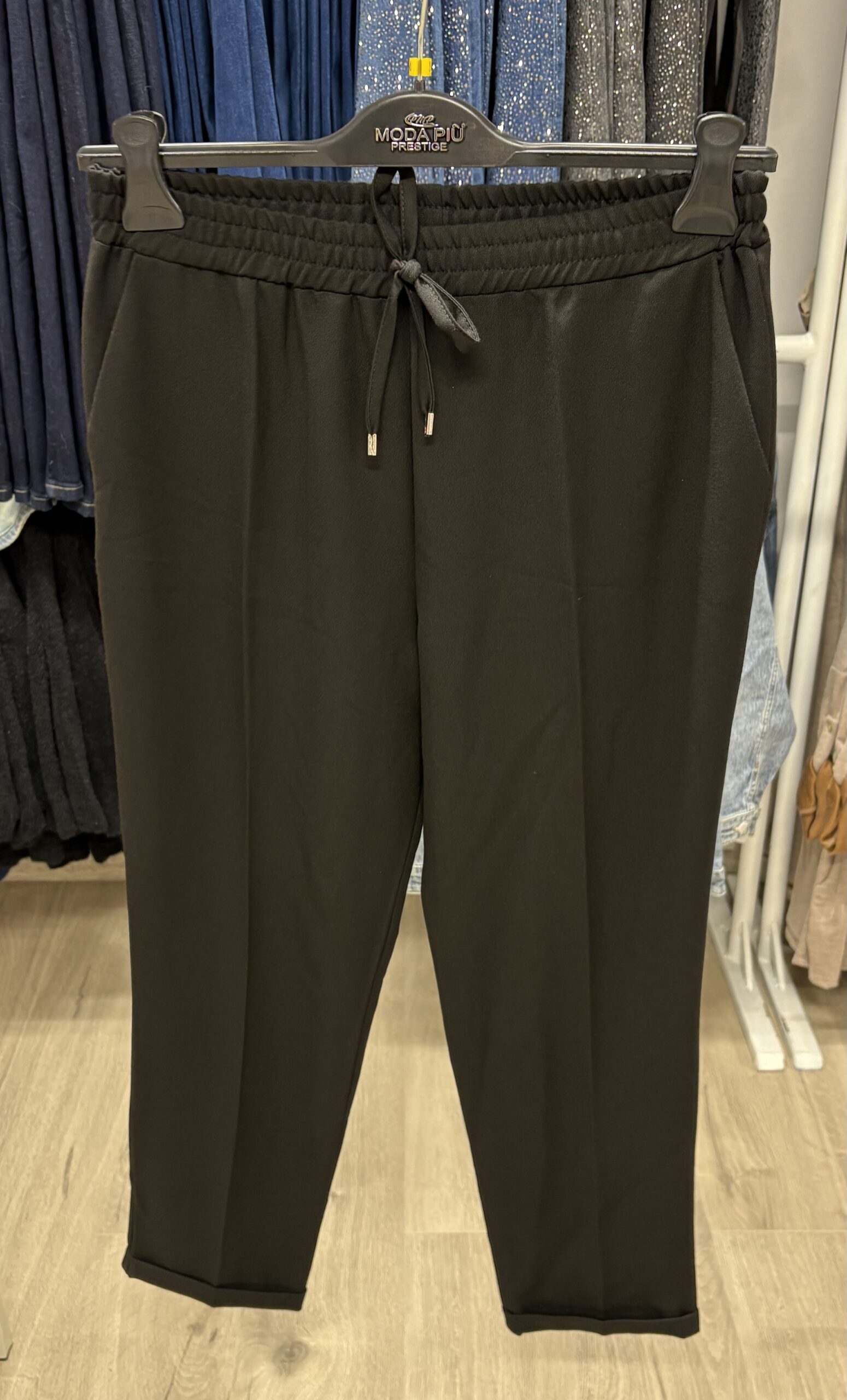 Acești pantaloni negri sunt alegerea perfectă pentru femeile care apreciază confortul, dar nu vor să renunțe la stil. Realizați dintr-un material plăcut și ușor, pantalonii au croială lejeră, ideală pentru mișcare liberă, și o talie elastică cu șnur reglabil, care se adaptează perfect oricărei siluete.