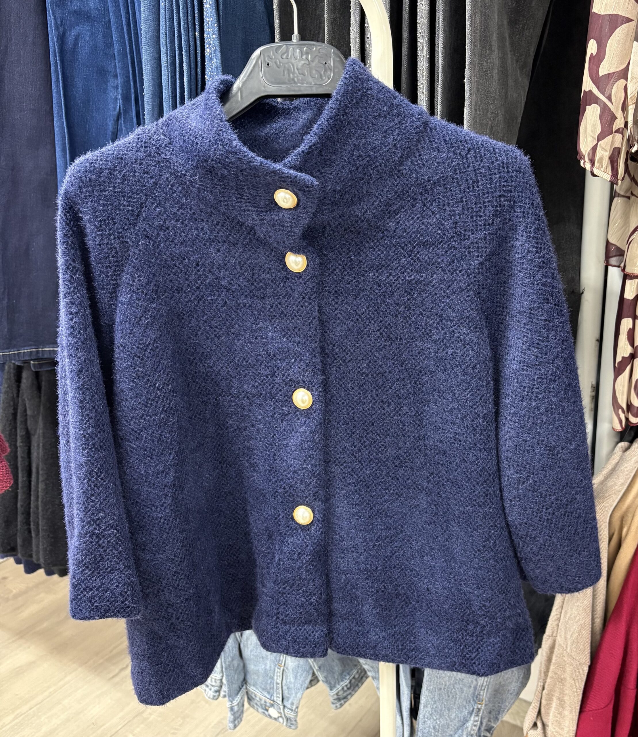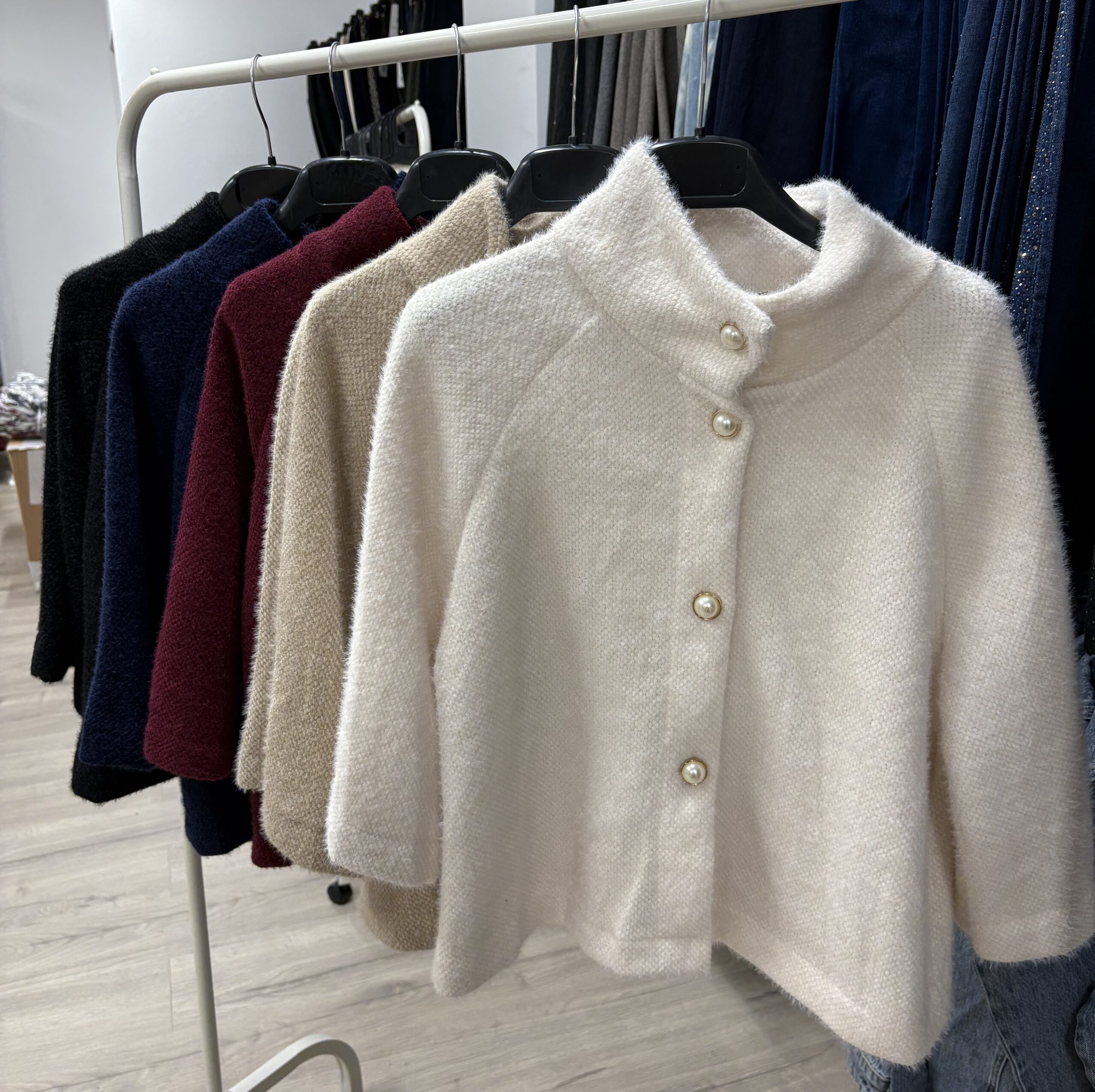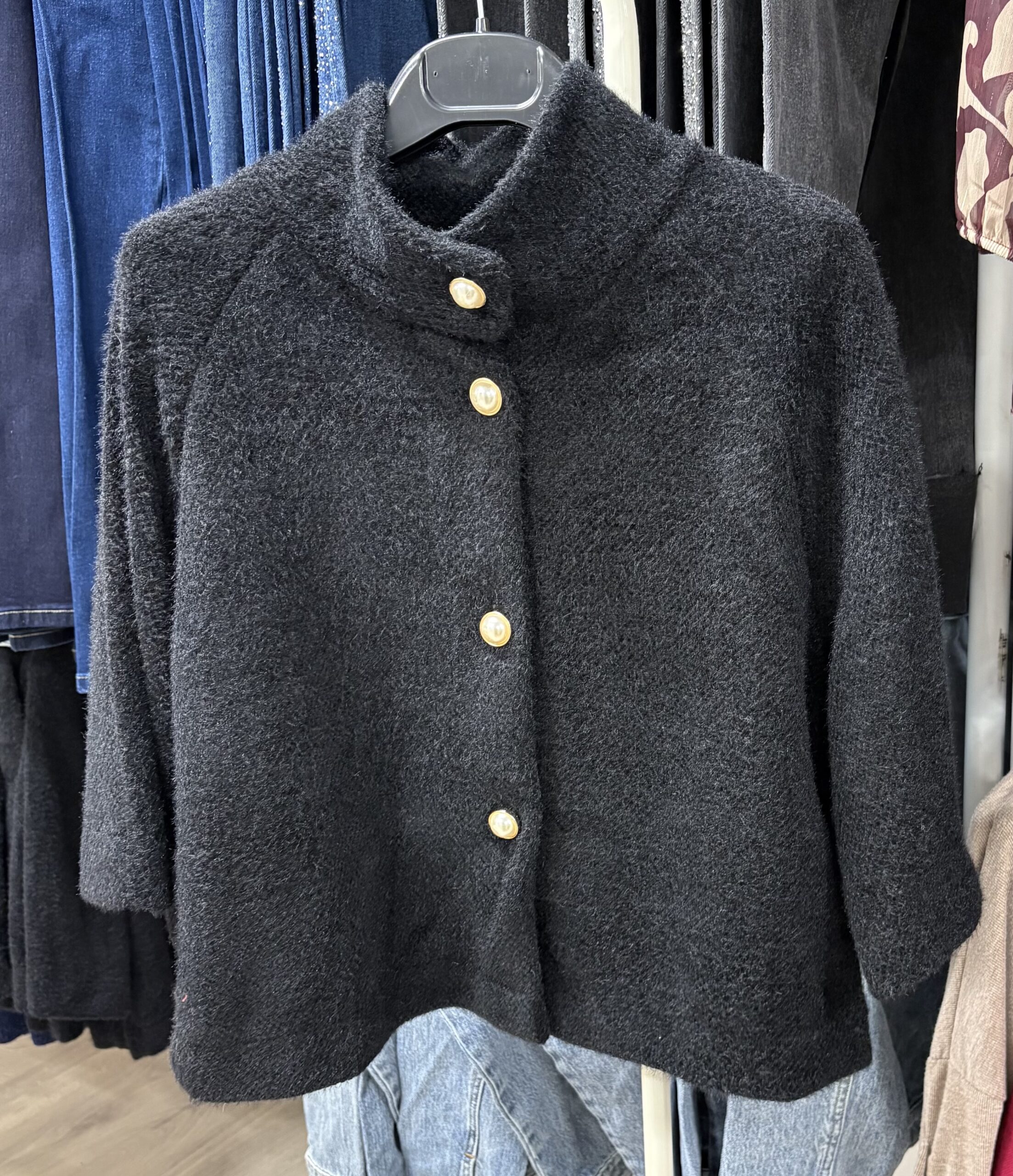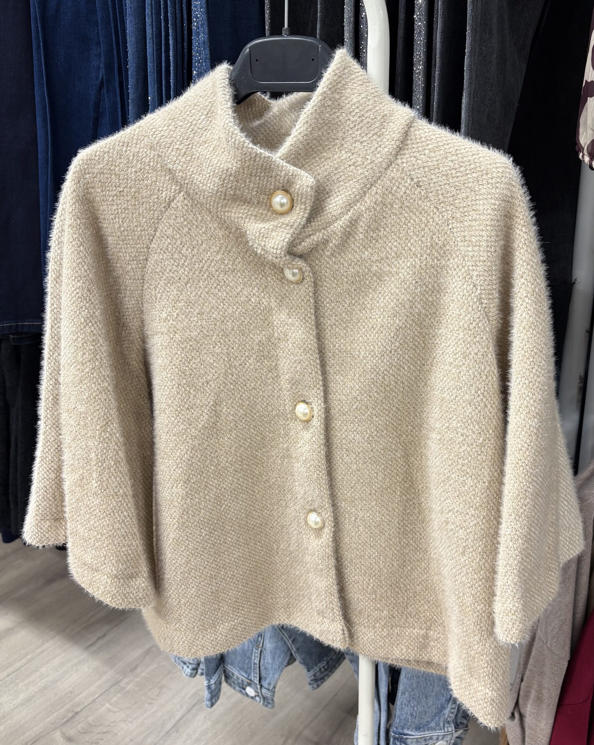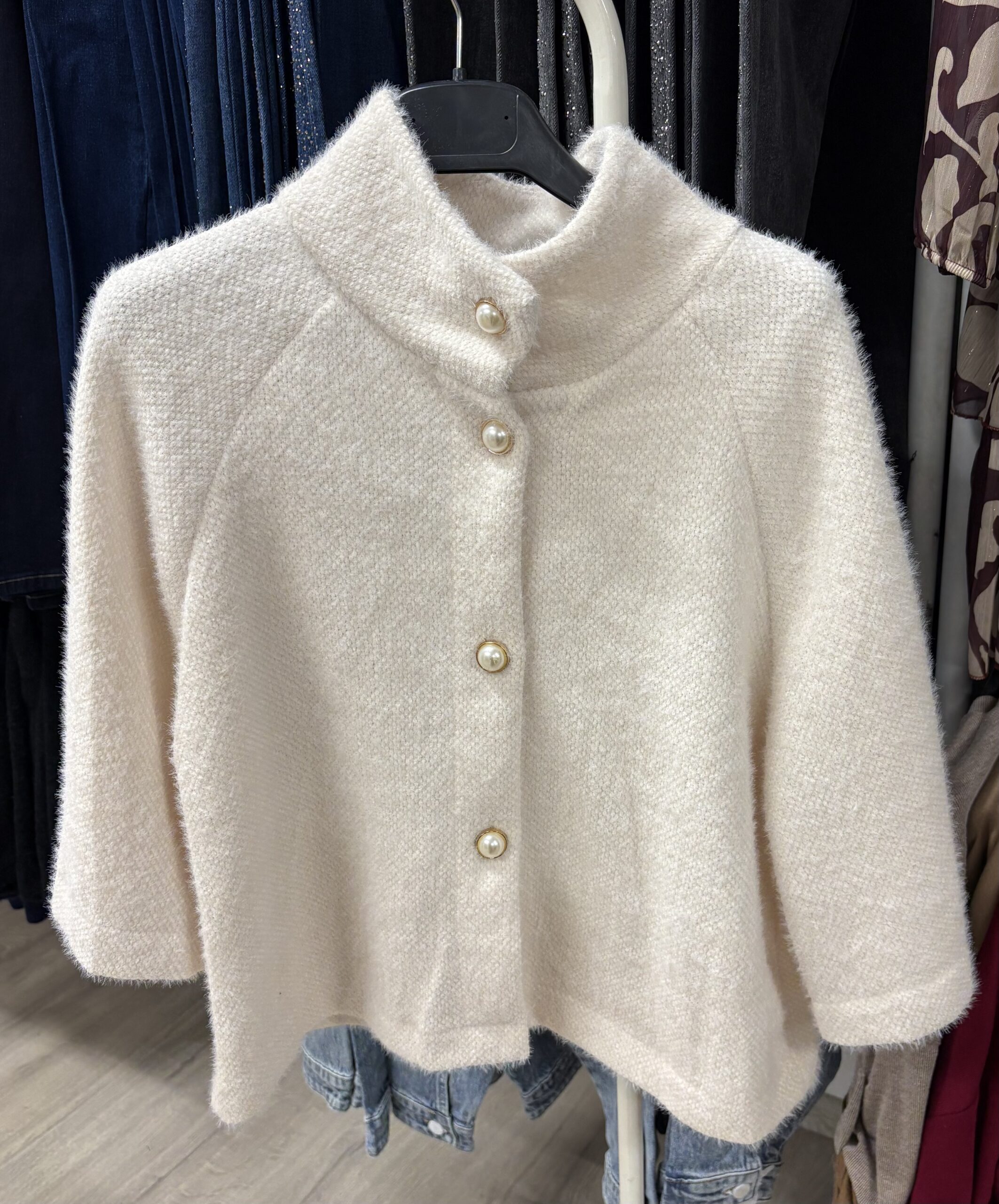 Acest cardigan tip paltonaș este alegerea perfectă pentru zilele reci, când vrei să fii feminină, dar și confortabilă. Croiala scurtă și ușor evazată îl face să se potrivească perfect peste rochii, fuste sau pantaloni. Se închide cu trei nasturi eleganți tip perlă, care îi dau un plus de rafinament.