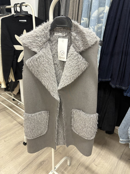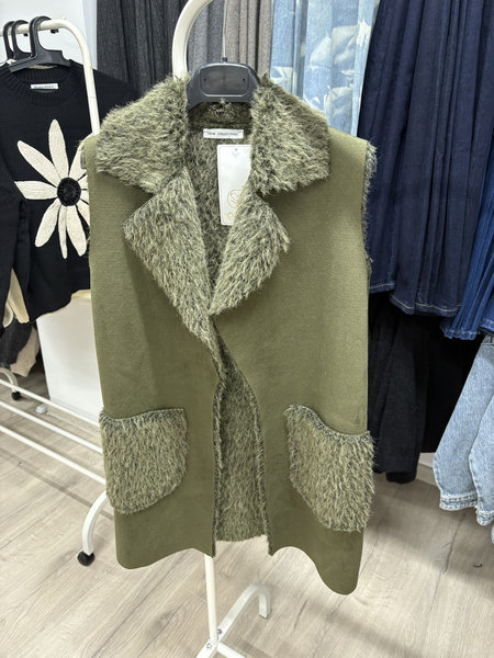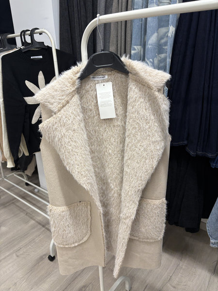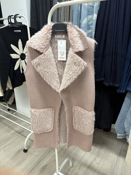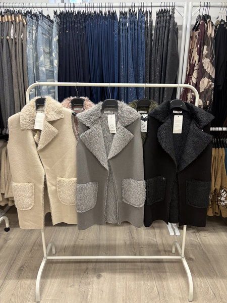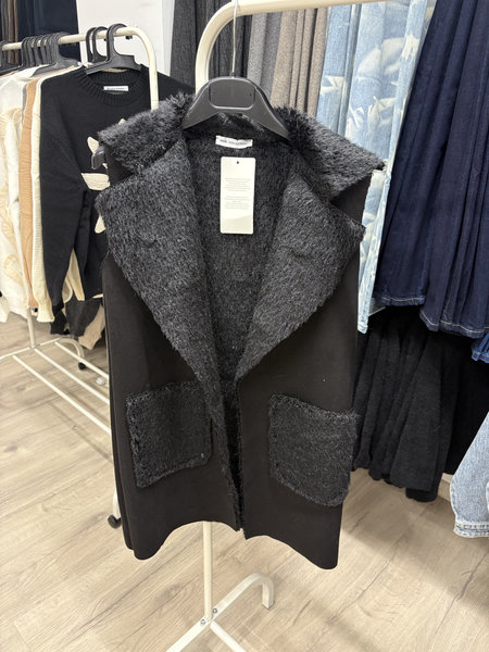 Vestă călduroasă din stofă moale, îmblănită la interior și pe detalii. Perfectă pentru ținute casual-chic, cu croială lejeră și buzunare frontale.