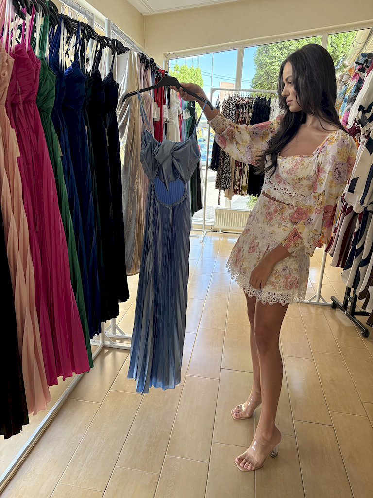 Rochie lungă, elegantă cu bretele subțiri, din material plisat. Decolteul moderat și talia accentuată subliniază silueta, iar croiala fluidă adaugă rafinament și feminitate.