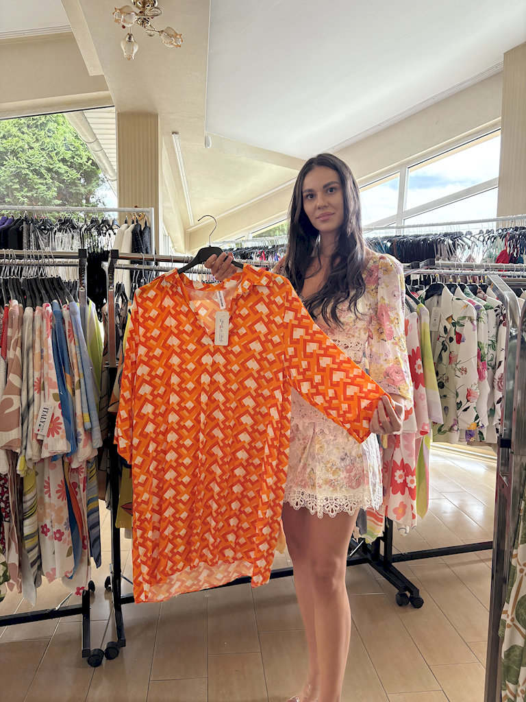 Rochie cu croială relaxată și imprimeu geometric modern, potrivită pentru ținute de zi și momente casual. Materialul ușor și designul fluid o fac plăcută de purtat, avantajoasă pentru diverse tipuri de siluetă. O piesă versatilă, ce aduce un plus de stil fără efort și se adaptează ușor oricărei garderobe.