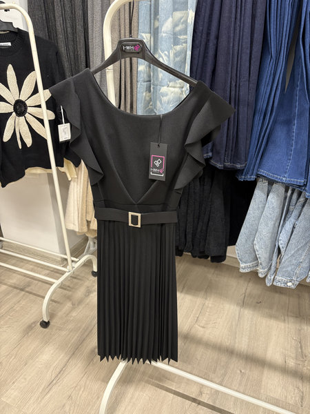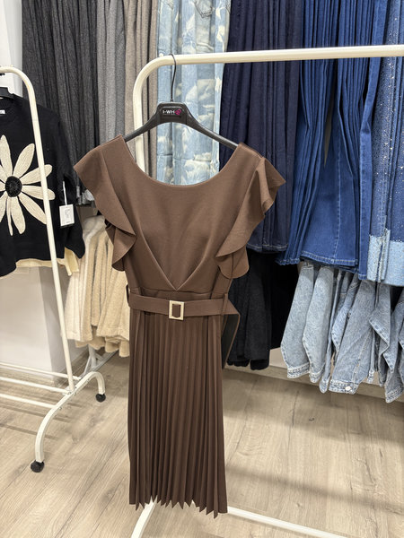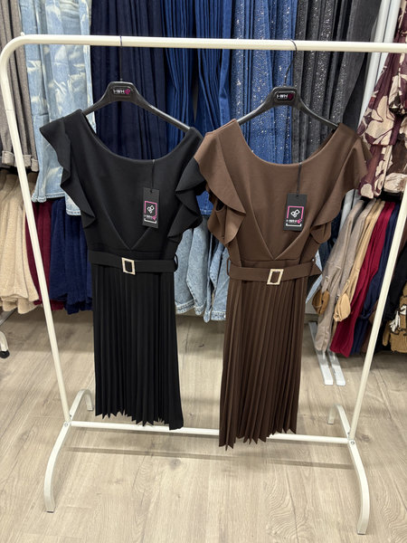 Această rochie midi elegantă îmbină rafinamentul cu confortul. Are o croială feminină, cu volane delicate la umeri și o fustă plissată ce adaugă fluiditate și grație fiecărui pas. Talia este accentuată de o centură cu cataramă, evidențiind silueta într-un mod subtil și elegant. Țesătura ușor elastică oferă lejeritate, iar designul minimalist o face ușor de accesorizat. Perfectă pentru petreceri, cine romantice sau evenimente de zi.